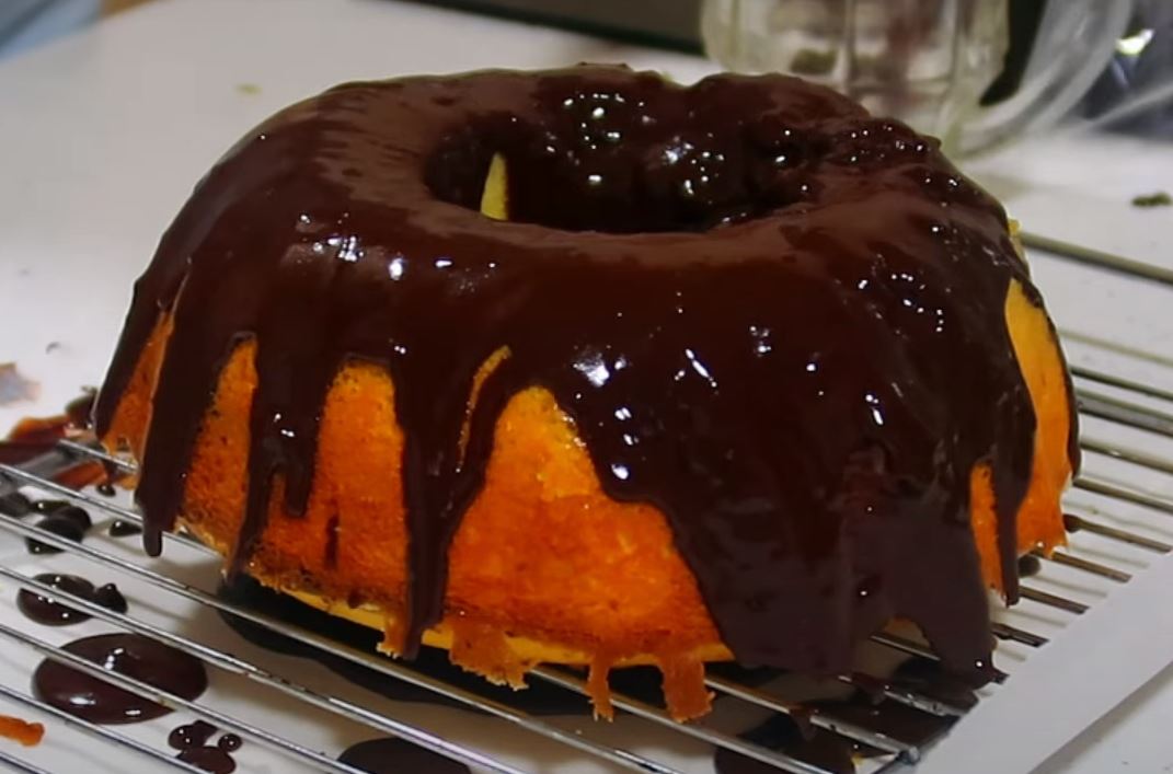 Ostavite da se potpuno ohlade te izvadite izkalupa, za to vreme napravite preliv, otopite 200g čokolade sa slatkom pavlakom. Prelijte preko kuglofa i ostavite da se stegne u frizideru (dok se čokolada stegne).