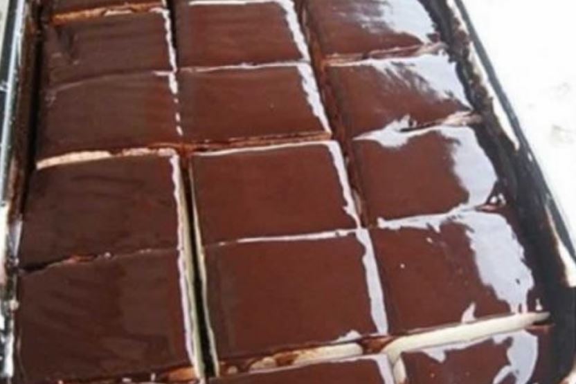 Kolač izvadimo iz rerne i prelijemo čokoladnom glazurom.Odmah ga i režemo na kocke .