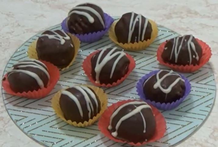 Pomešati margarin i šećer u prahu. Zaleđenu pomorandžu izrendati sa sve korom i dodati u margarin. Zatim dodati mleveni keks, umešati i umesiti. Od smese praviti kuglice. Istopiti crnu čokoladu sa uljem. Kuglice potapati u glazuru i stavljati na papir za pečenje. Ostaviti ih u frižideru da se stegnu i ohlade. Istopiti belu čokoladu sa uljem pa našarati kuglice.
