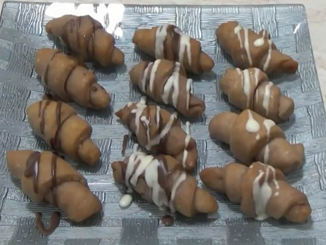 Pomešati ulje i vino. U brašno umešati prašak za pecivo. Postepeno dodavati brašno u ulje i vino i zamesiti testo. Testo pokriti samolepljivom folijom i kuhinjskom krpom i ostaviti pola sata na sobnoj temperaturi da odstoji. Potom testo izdeliti na 6 delova i svaki deo malo premesiti. Zatim svaku lopticu rastanjiti na debljinu 5 milimetara i iseći na 12 trouglova. Na svaki trougao staviti po četvrtinu jezgra oraha i zamotati u kiflicu. Kiflice peći u rerni zagrejanoj na 200 stepeni oko 15 minuta. Za sirup sipati šećer u vodu, dodati malo ekstrata ruma i kuvati na umerenoj temperaturi 5 minuta. Vruće kiflice potapati u vruć sirup i okretati da dobro upiju. Istopiti belu i crnu čokoladu sa uljem i ukrasiti kiflice.