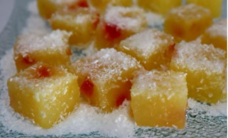 KUJNA,Posno | April 17, 2021 izvor:Domaći Kuhar Griz: 6 kašika griza 2dl soka od limuna Puding: 2 pakovanja pudinga od vanilije 14 kašika šećera 2dl vode Za prokuhati: 2dl vode Ostalo: kokos žele bombone Detalje pripreme pogledajte u videu: Čokoladne kuglice sa pudingom Kolač od banane bez jaja za 5 minuta