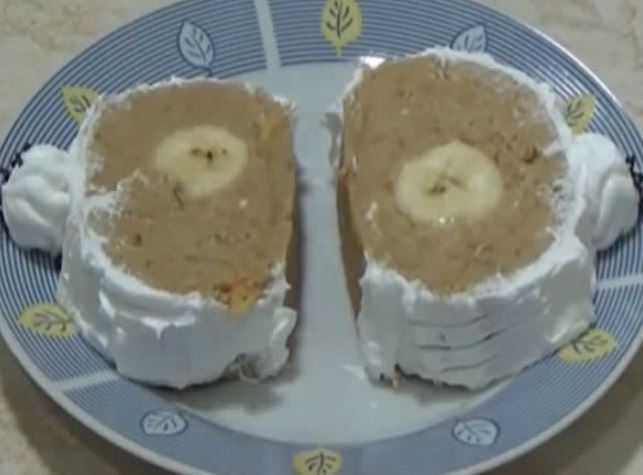 Dve banane očistiti, iseći na kolutiće i izgnječiti. Dodati margarin i umutiti. Dodati rendane jabuke i izmešati. Sipati šećer u prahu i promešati. Na kraju dodati mleveni keks i zamesiti smesu. Rastanjiti smesu na papiru za pečenje. Preostale dve banane staviti duž jedne ivice i zamotati rolat. Rolat ostaviti tri sata u frižideru da se stegne. Umutiti šlag i ukrasiti rolat.