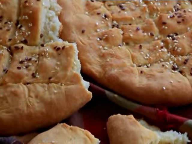 Brasno, so, prasak za pecivo izmesajte. Dodajte kiselu vodu i ulje pa zamesite testo. Podelite na tri dela i oblikujte pogace velicine velikog tanjira. Premazite uljem, isecite nozem odozgo, pospite susamom i pecite u zagrejanoj rerni dok ne porumeni, oko pola sata. Vruce prekrijte krpom i ostavite desetak minuta. Prijatno!