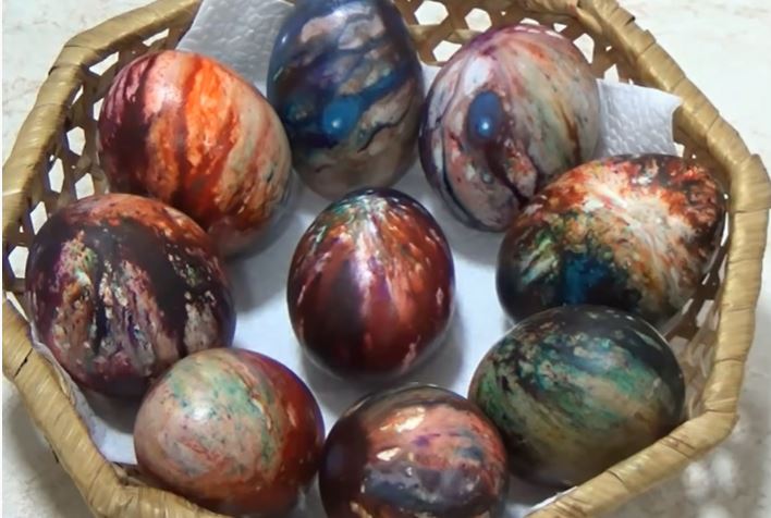 U šerpu sipati vodu. Preko staviti šerpu za ceđenje (sa perforiranim, izbušenim dnom). U ovu posudu staviti kuvana jaja. Poklopiti šerpu i staviti da voda provri. Kad je para okvasila jaja, poprskati malo sirćetom, pa posuti bojama. Zatim malo poprskati sirćetom i kuvati 5 do10 minuta. Kad se jaja ohlade, premazati ih uljem da dobiju sjaj.