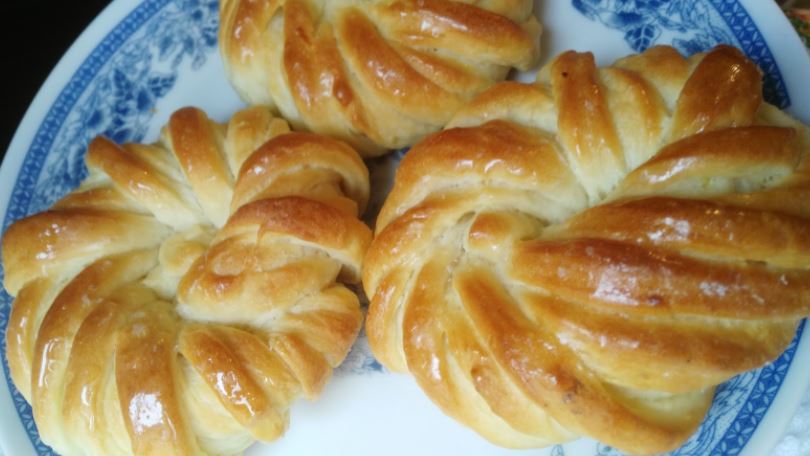 Uvijenu kiflicu saviti u krug i zaviti u sredinu kao što je prikazano na slici. Namazati mlekom i ostaviti da naraste i peći na 200 stereni C oko 20 min.