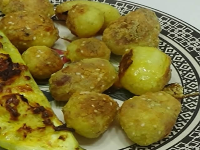 Sve poređati u pleh obložen pek papirom i peći u zagrejanoj rerni na 200c/30min.Pred sami kraj desetak minuta poprskati malo maslinovim uljem.
