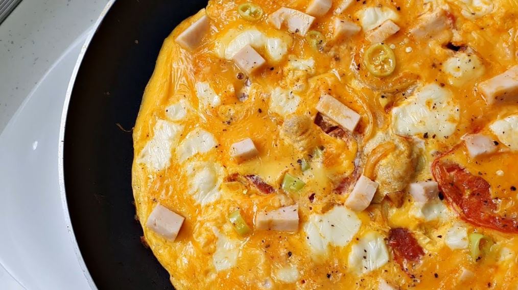 Dodajte jaja i odmah sir, šunku i papriku. Malo soli i bibera. Poklopite i pecite cca 5 min . Vaš savršeni omlet je gotov – prijatno.