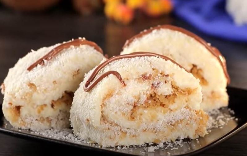 Otopite puter pa dodajte brašno, mešajte neprestano na laganoj vatri. Zatim postepeno dodajte mleko uz stalno mešanje. Dodajte šećer i vanilin šećer. Na plehu 30×40 koji je obložen pek papirom pospite kokosove pahuljice. Preko toga izručite prethodnu smesu, poravnajte pa pospite orasima. Stavite u frižider da se stegne 3h. Nakon toga uvijte smesu u rolat. Dobićete 2 koluta, jer ćete preseći smesu po širini. Prelijte otopljenom mlečnom čokoladom.