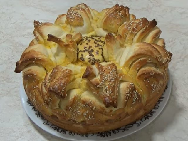 Složeno testo u plehu iseći na 8 trouglova. Vrhove trouglova od centra preklopiti prema kraju i pričvrstiti čačkalicom. U centar staviti šestu lopticu testa. Premazati pogaču umućenim jajetom. Posuti semenkama susama i lana. Staviti u zagrejanu rernu na 200 stepeni i peći oko 30 minuta.