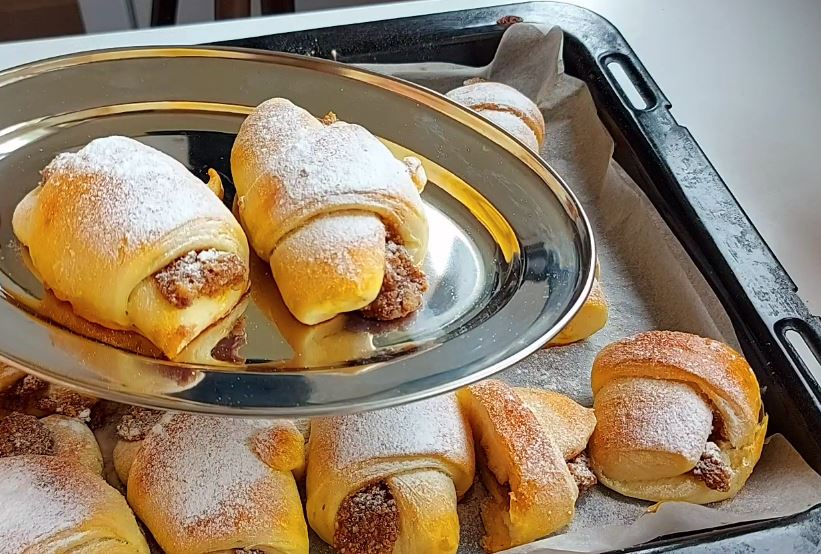 Izmešati džem i orahe. Testo iseći na ćetvrtine a svaku četvrtinu na dva dela formirajući trouglove. Puniti i uvijati kiflice. Redjati u podmazan pleh pa pokriti da odmori 15 min. Po želji se može premazati žumancetom .Peći na 200 stepeni 30 min da porumene. Pokriti krpom. Mekani kao pena..uživajte..