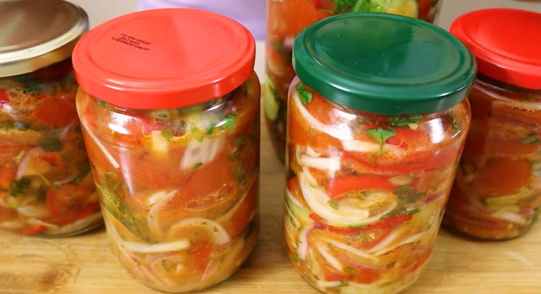 Zimnica od paradajza, paprike, krastavca, sa lukom, belim lukom i peršunom.