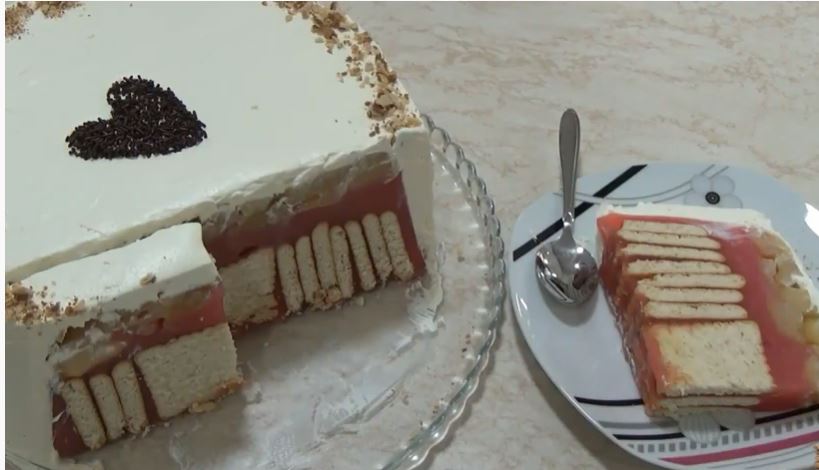 Dublju tepsiju prečnika 23 cm obložiti folijom. Prvo sipati i uravnati jabuke. Preko jabuka sipati puding. U puding utopiti keks, uspravno i pritisnuti da se utopi do dna. Tortu prekriti folijom i ostaviti u frižideru nekoliko sati da se ohladi i da keks omekša. Ohlađenu tortu prevrnuti na tacnu. Umutiti šlag i premazati tortu. Po želji ukrasiti izmrvljenim keksom.