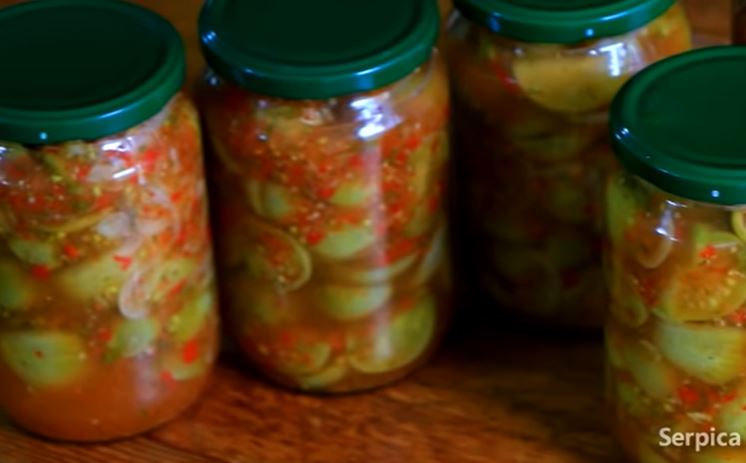 Sipajte u tegle zajedno sa sokom, trebalo bi da ga bude do polovine tegle(soka). Ako stavljate biber u zrnu, lovorov list i slačicu najbolje ga ih na kraju stavljate u teglu, u svaku po malo. Sipajte u svaku teglu 30 mililitara sirćeta, dobro zatvorite i složite u šerpu. Na dno šerpe predhodno stavite krpu ili stoljnjak. Kada ste poređali tegle nalijte vodu i stavite na šporet da se kuvaju. Od tačke ključanja 30 minuta. Ugasite ringlu i ostavite tegle u vrućoj vodi još 10-15 minuta. Izvadite i obrišite svaku, utoplite, tegle treba da su preokrenute naopačke. Sutradan odpakujte i ređajte u špajz. Uživajte već posle dve nedelje u super ukusu ove salate. Prijatno!