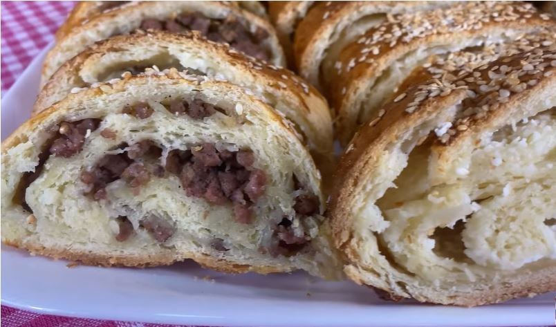 Aktivirati kvasac i umesiti meko testo. Ostaviti da se udvostruči. Iseći na tri dela pa razviti u pravougaonik. Svaki deo puniti posebnim nadevom pa uviti u rolat. Premazati žumancem i posuti susamom. Peći na 180 stepeni 30-34min. Prijatno!