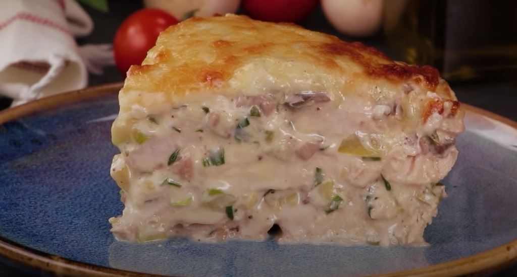 Pečurke i tikvice iseckajte, pa propržite. Sipajte povrće u posudu, posolite i pobiberite, dodajte rendani tvrdi sir, seckani peršun i krem sir. Sipajte preko mesa i tako ređajte meso, kremasto povrće. Poslednji sloj treba da bude povrće.