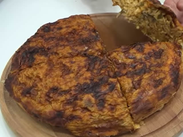 Ova je veoma ukusna pita na vodi bez kapi ulja sa pirinčem i šampinjonima oduševiće mnoge.Malo je njih koji će i primetiti da nema ulja.Pita je prepuna nadeva tako da vam kompleno može zameniti obrok.