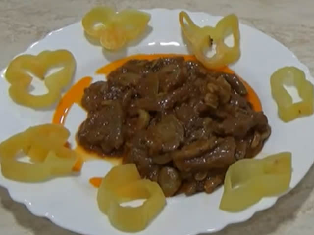 U šerpi na malo ulja izdinstati crni luk. Potom dodati meso isečeno na kockice, malo začina i soli i nastaviti dinstanje. Dodati iseckanu pariku i sitno iseckan beli luk. Dinstati dok meso i paprika ne omekane. Dodati iseckane šampinjone i nastaviti dinstanje. Sipati mleveni paradajz, brašno i mlevenu papriku, izmešati, dodati vode po potrebi i začina po želji i nastaviti dinstanje do kraja.