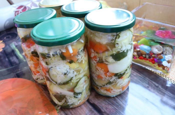 Preliti preko salate i dobro izmešati. Pokriti pa svaki 2-3 sata izmešati. Ostaviti preko noći i sutra sipati u tegle.