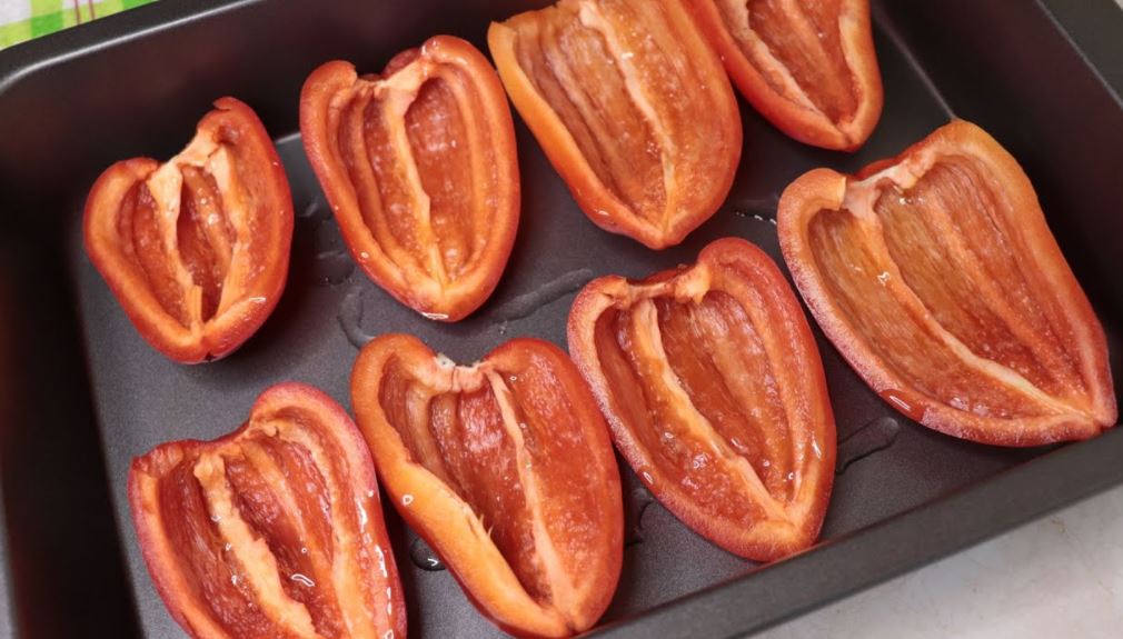 Priprema: Paprike isecite po dužini i očistite od peteljki i semenki. Poređajte ih u pleh i pospite uljem i malo posolite. Ubacite ih na 10 minuta u rernu na 200 stepeni.