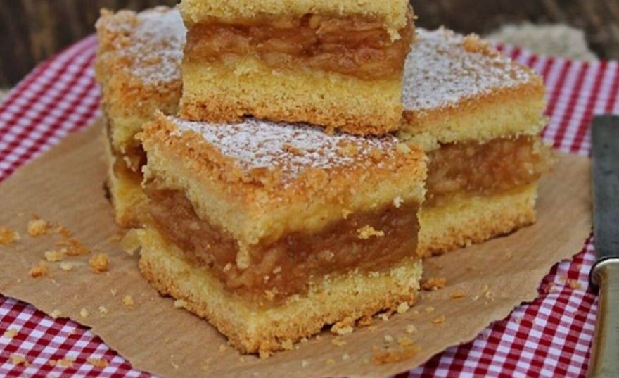 Tijesto podijelimo na dva dijela. pobrašnimo radnu površinu i razvučemo prvo tijesto veličine lima za pečenje, lagamo tijesto prebacimo u lim za pečenje, preko njega stavimo fil od jabuka (topao) i ravnomjerno premažemo.