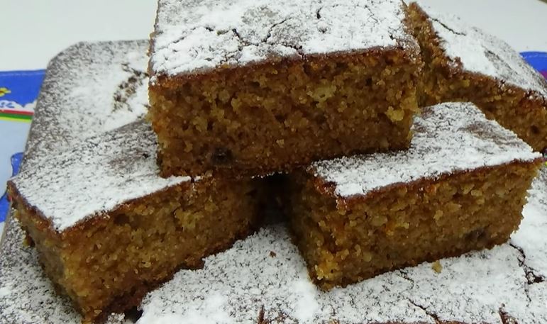 Sve sastojke sjediniti izliti u pleh 25/35cm. Peći u zagrejanoj rerni na 200c/25min. Kad se prohladi posipajte šećerom u prahu, glazurom od čokolade ili jednostavno premažite džemom i posipajte mlevenim orasima.