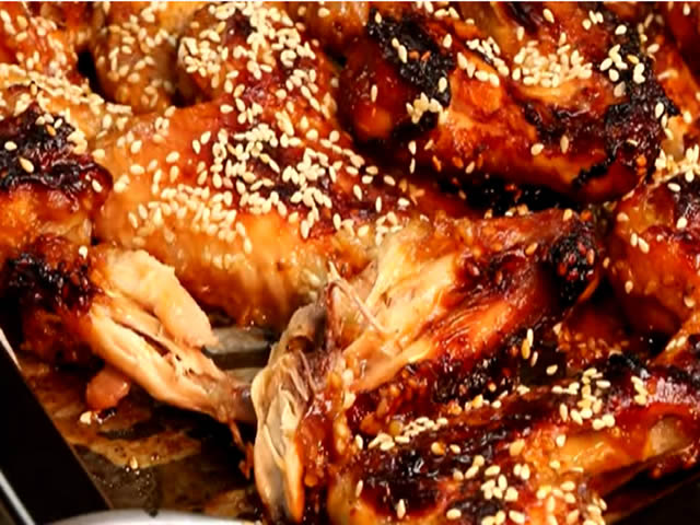 Krilca operite, odstranite vrhove obrišite papirinim ubrusom. Posolite i uvaljajte u brašno. Izmešajte kečap,soja sos, med i biber. Prelijte preko mesa i dobro istrljajte rukama da se sos suvgde zalepi. Stavite susam.