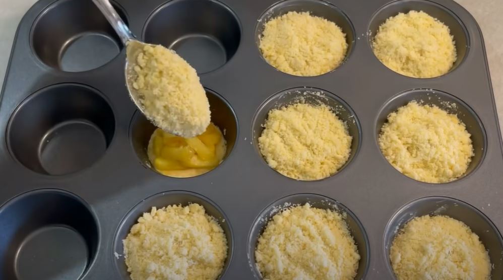Zatim dodajte puter i rukama sjedinite, da dobijete mrvičasto testo. Zatim dodajte i žumance. Dobro sjedinite. Kalup za mafine premažite puterom. Sipajte kašiku testa, čašom pritisnite, pa stavite fil od jabuka. Preko stavite još malo testa, ali sada ostavite tako mrvičasto. Pecite u zagrejanoj rerni na 180°C nekih 20 minuta.
