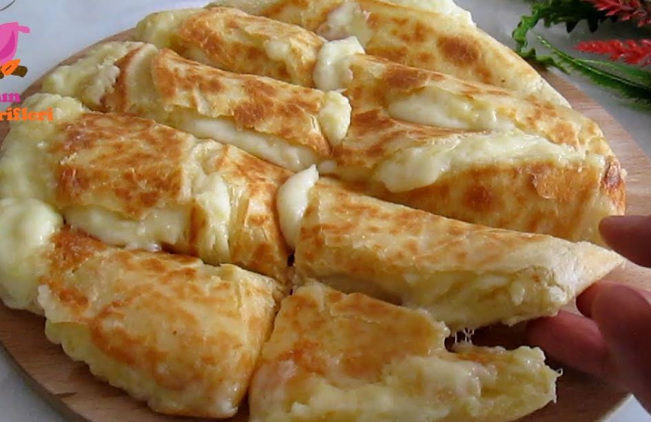 Na sredinu stavite rendani kačkavalj, pa preko i pire i ostatak kačkavalj ( od te smese treba da napravite poluloptu). Zatvorite ostatkom testa i pritisnite malo prstima. Zatim rukama malo spljoštite, a onda i oklagijom. Nauljite tiganj, pa stavite pitu. Pecite na niskoj temperaturi.