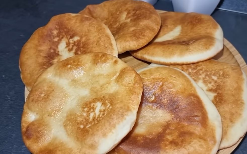 Ostavite da odmori 40 minuta pokriveno. Podelite na 5 delova i oblikujte loptice. Pokrijte i ostavite da odmori 10 minuta. Razvucite testo i pecite u dosta ulja.
