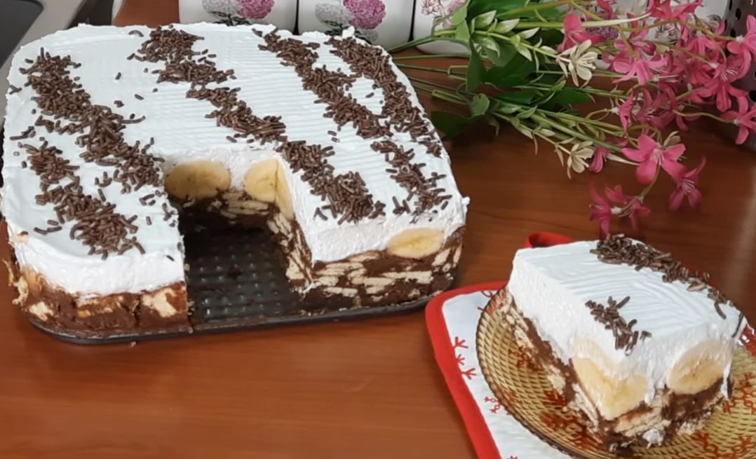 Keks izlomiti na sitne komadiće. Čokoladu otopiti sa mlekom, pa sjediniti sa keksom. Promešati pa prebaciti u kalup. Odozgo naredjati banane i preko staviti umućen šlag. Nositi na hladjenje 2-3h. Ukrasiti po želji. Prijatno!