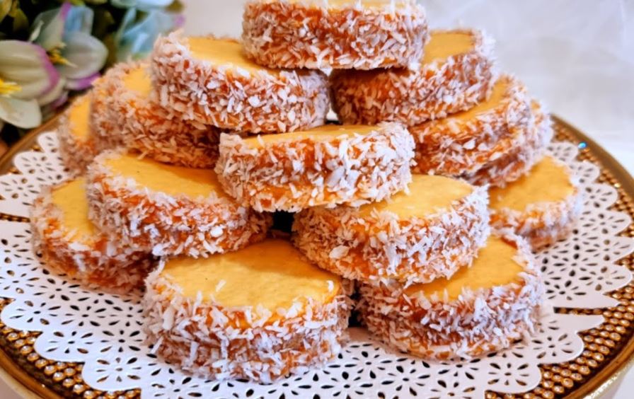 Razvucite tanko na pek papiru, pa stavite na pleh i u zamrzivač na 10 minuta. Čašom vadite oblike. Poređajte na pleh i pecite na 170°C oko 10 minuta. Polovinu keksića premažite kuvanim kondenzovanim mlekom, a drugom polovinom preklopite. Premažite i sa strane i uvaljajte u kokos.