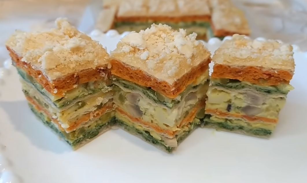 Zelena kora pa fil ; crvena kora pa fil pa 50 g. slanih posnih krekera poredjati krekere na filu odozgo ponovo fil pa zelena kora pa opet fil i crvena kora.