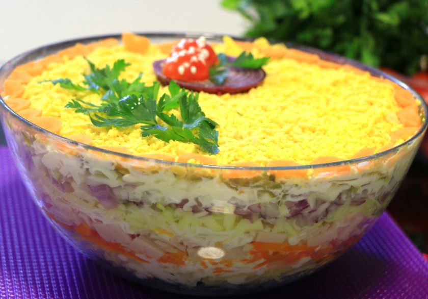 Prelepa salata od povrća, majoneza, jaja i kiselih krastavaca.