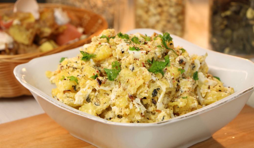 Krompir i jaja ogulite, pa izrendajte ili iseckajte. Ispecite semenke i izdrobite.