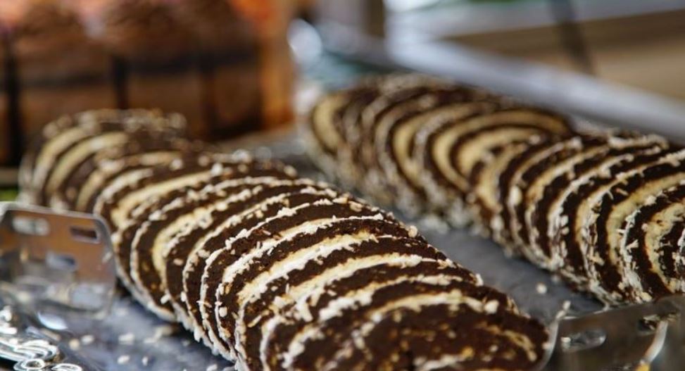 150 g margarina umutiti sa 250 g prah secera i dodati 200 g kokosa pa premazati preko razvijene kore.Urolati dobijenu koru i ostaviti 15 minuta u frizideru.poslije toga isjeci i sluziti.