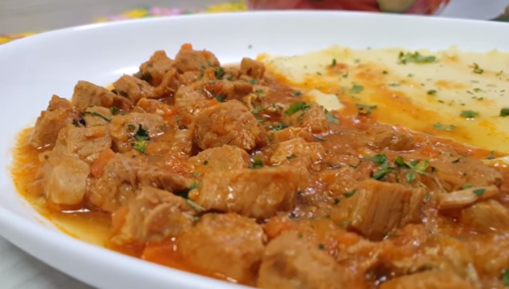 Kada se luk karamelizovao dodajemo meso i ostavljamo da se sve dinsta 20 minuta na srednjoj temperaturi. Vodu ne dodavati jer će meso i povrće pustiti svoje sokove