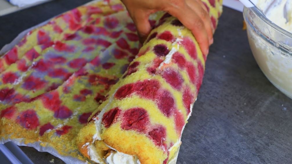 Ohlađen nafilujte filom, urolajte pa odozgo premažite sa umućenom slatkom pavlakom ili šlagom ali možete ga ostaviti i tako pa posuti šećerom u prahu ili išarati rastopljenom čokoladom.