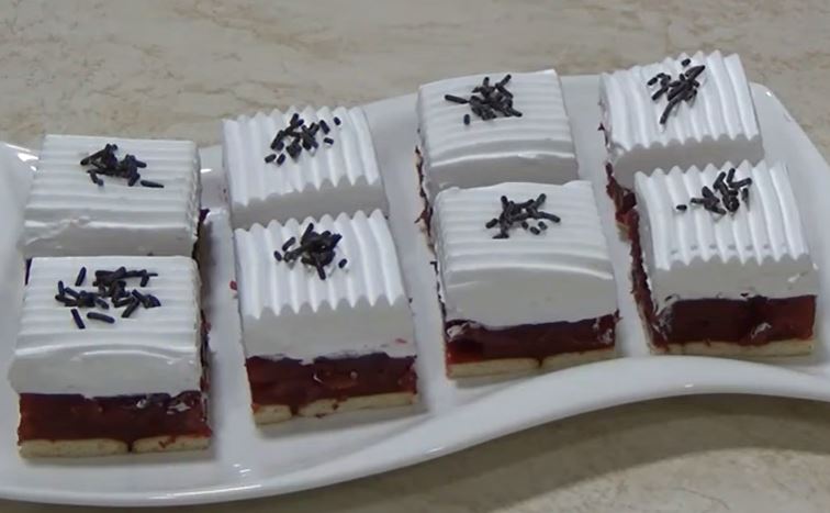 Pleh veličine 20×30 cm obložiti papirom za pečenje i poređati keks. Preko keksa sipati vruć fil i ostaviti kolač da se dobro ohladi.