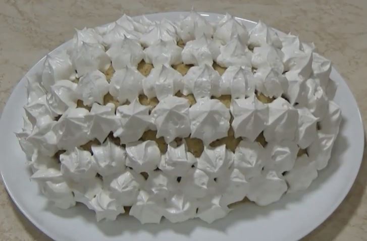 Smesu na tacni oblikovati u obliku jajeta. Tortu staviti u frižider. Umutiti šlag sa kiselom vodom i ukrasiti tortu.