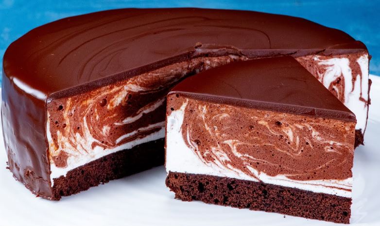 Umutiti belanca sa šećerom u prahu, dodati razmućen želatin pa preliti polovinu smese preko kore, a u drugu polovinu dodati 20 g kakaa i umutiti. Sipati preko belog fila i promešati kašikom lagano da se prošaraju filovi (pogledajte video). Poravnati pa staviti u frižider na dva sata.