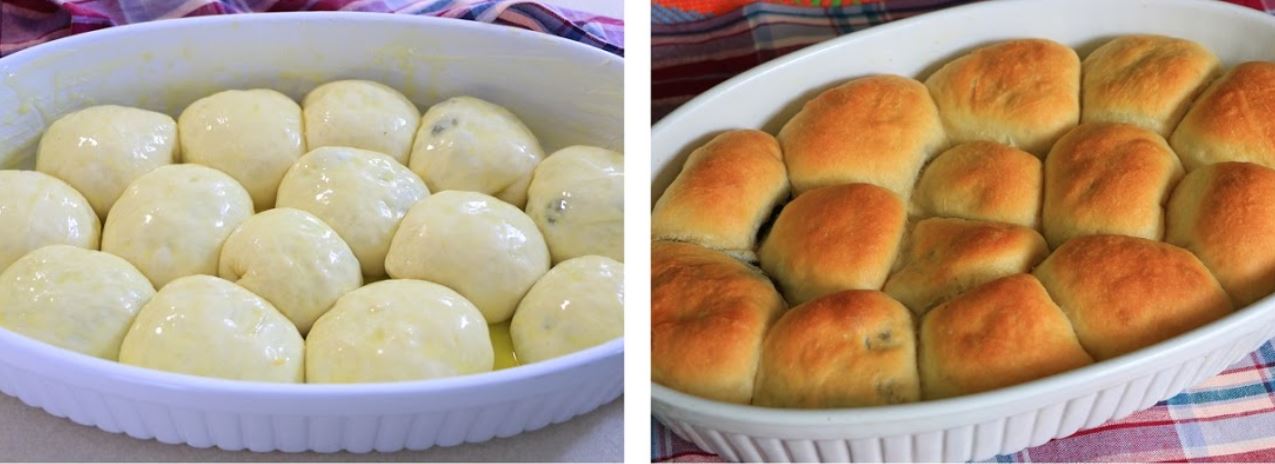Složite u margarinom podmazan pleh, ostavite da stoji prekriveno krpom dok se rerna zagrena (220 stepeni)..rastopite margarin i pre pečenja buhtle dobro premažite. Peku se oko 25 – 30 minuta. Pečene možete premazati rastopljenim margarinom, prekriti krpom i ostaviti desetak minuta. Pospite šećerom u prahu i poslužite. Prijatno!