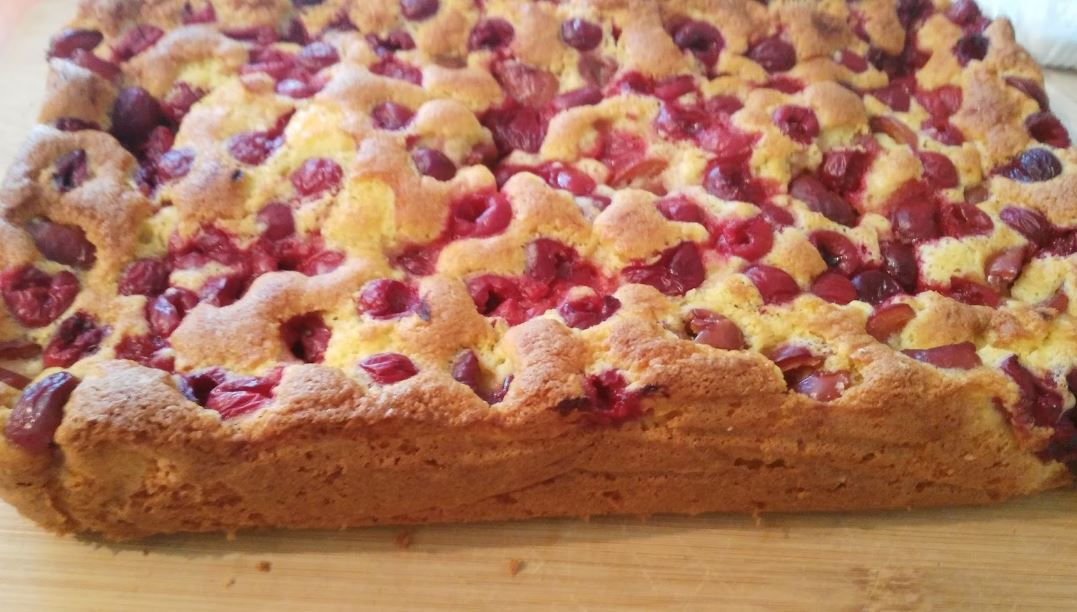 Pleh veličine 30×20 obložiti pek papirom sipati smesu i odozgo poredjati višnje i trešnje. malo ih prstima gurnuti u testo da ne budu sve na vrhu. Peći na 200 stepeni C prvih 15 min pa smanjiti na 180 stepeni i peći 40 min.