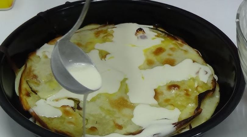 Izvaditi iz rerne, premazati kajmakom, pa odmah preliti novim slojem testa.