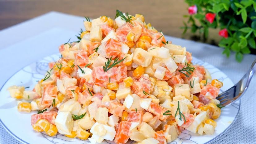 Priprema: Šargarepu skuvajte, a zatim isecite na kockice, kao i jabuku i jaja. Crni luk iseckajte, pa dodajte šećer, so, vodu i sirće i kratko marinirajte. Dodajte u salatu kao i kukuruz. Sve lepo sjedinite sa majonezom.