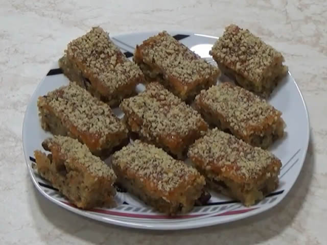 U pleh dimenzija 24 x 34 cm na papir za pečenje izručiti smesu. Staviti u zagrejanu rernu na 200 stepeni da se peče 20 minuta. Preko vrućeg kolača premazati džem. Zatim kolač posuti mlevenim orasima i ostaviti na sobnoj temperaturi da se ohladi.