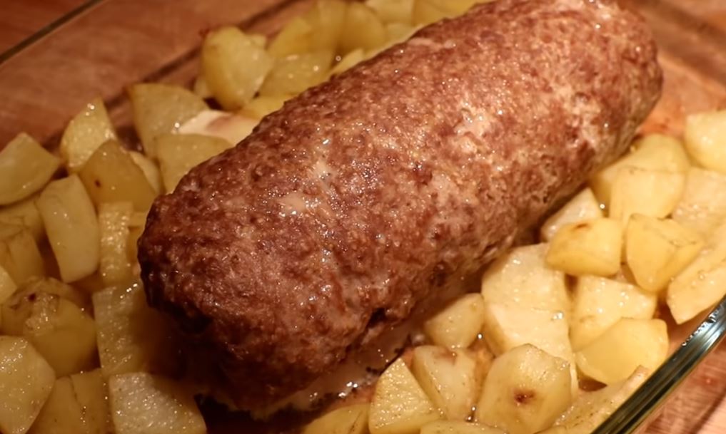 Sada, uz pomoć pek papira uvijte mesni rolat. Uvijte ga u pek papir kao bombonu. Krompir iseite na kockice, posolite pa poređajte u nauljenu vatrostalnu posudu. U sredinu stavite uvijen mesni rolat. Pecite u zagrejanoj rerni na 180 stepeni pola sata.