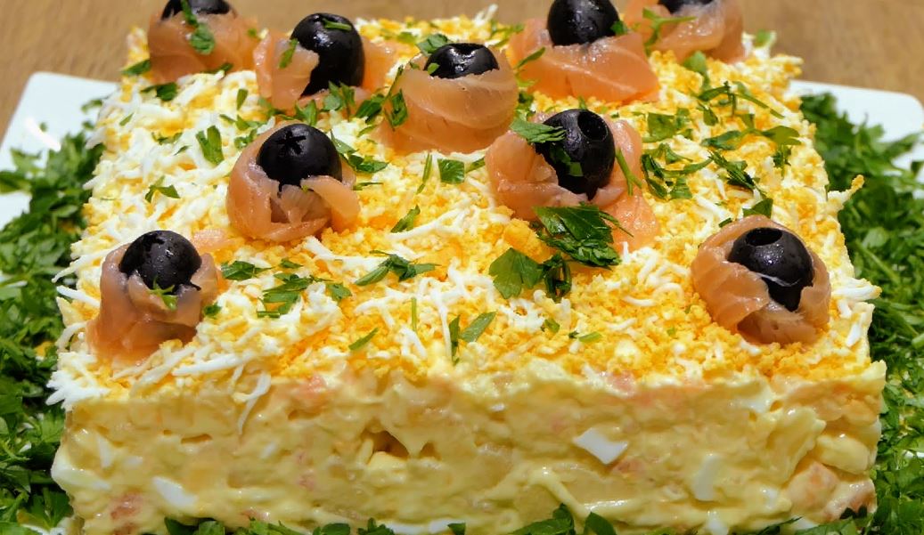 Priprema: Prvo obarite krompir i jaja, pa ih sitnije isecite i poređajte u posudu. Potom dodajte i iseckan losos. Posolite i sipajte majonez i senf. Sve dobro promešajte i činiju odložite u frižider na 2 sata, kako bi se namirnice dobro rashladile. Zatim smesu stavite u kalup i oblikujte. Kada je izvadite, preko narendajte dva jaja i ukrasite je po svom ukusu.