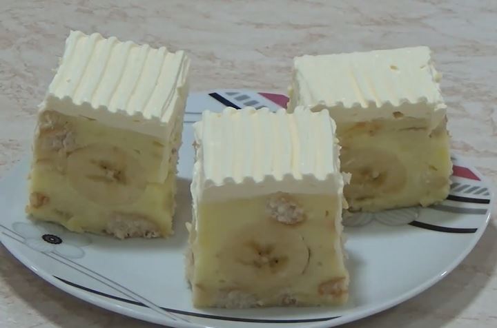 U pleh veličine 23×33 cm, obložen streč folijom sipati pola smese. Banane očistiti i iseći na polovine da bi se pravije složile preko kolača. Preko poređanih banana sipati ostatak fila. Kolač ostaviti na sobnoj temperaturi da se ohladi, potom staviti u frižider na nekoliko sati. Ohlađen kolač prevrnuti na poslužavnik. Umutiti šlag sa kiselom vodom i ukrasiti kolač.