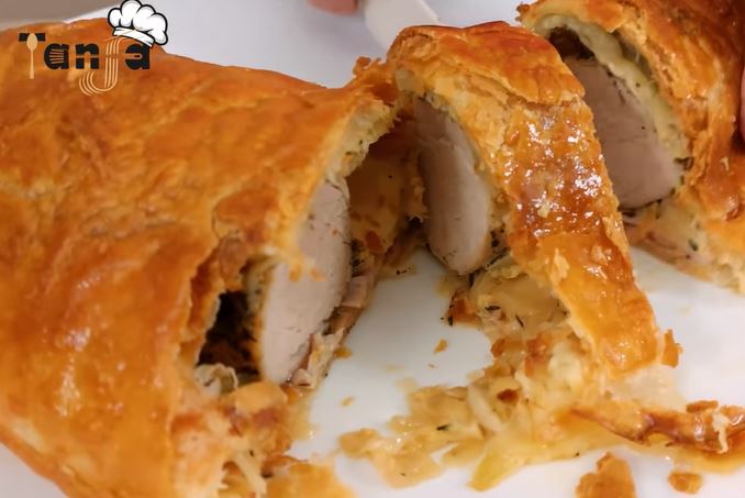Svinjski file rolovan u lisnatom testu, sa šunkom, tvrdim sirom i lukom, iz rerne. Brzi recept za ručak ili večeru. Pogodan za svečani sto ili goste.