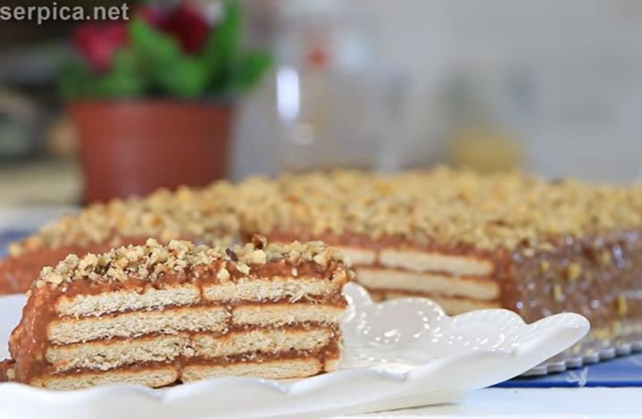 Pripremite manju tepsiju, obložite folijom ili kesom, poređajte 200 gr. keksa, premažite sa dve do tri kutlače fila, opet keks i tako do kraja. Na kraju ne premazujte, već ostavite fila da se posle premaže. Gornji keks premažite malo vodom pa prekrijte folijom ili kesom i držite u frižideru nekoliko sati da se stegne.